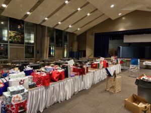 Our volunteers wrapping gifts given generously by the Community!